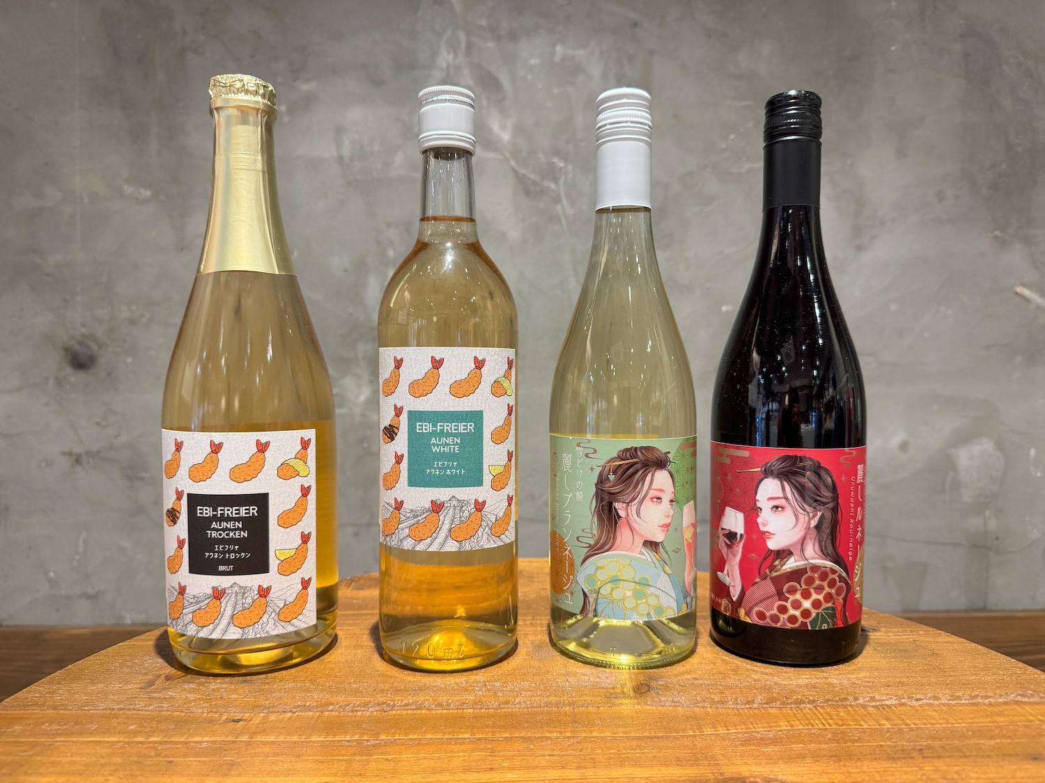 北海道や山梨などで造られたブドウをその産地のワイナリーで醸した国産ワイン。一風変わった「エビフライ」のために作られたスパークリングなど、ネーミングにも注目したいこだわりのワインをご用意しました。